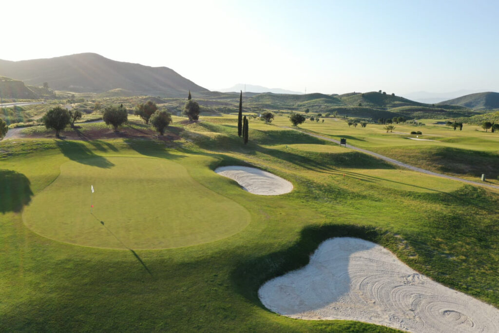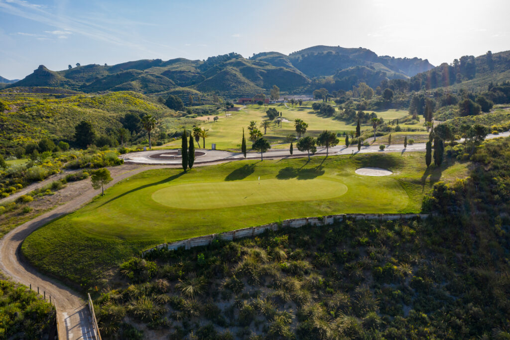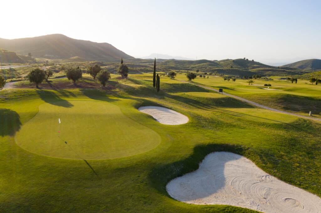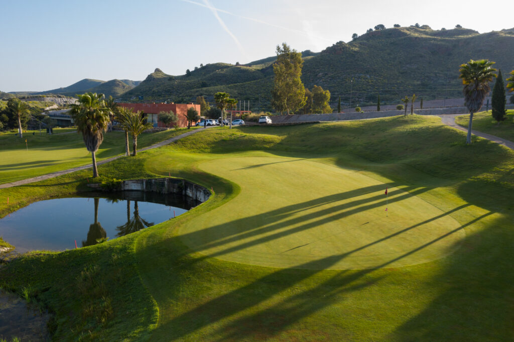 It is set in the foothills of the Almenara mountain range, using the natural terrain to create the hazards with dry ditches, water and well placed bunkers. The views across the Sierra de Almenara are stunning. The course and surrounding area are very well maintained and the fairways are wide although you'll need to strike the ball well. There are 26 white sand bunkers and several ravines requiring carries (long on occasion), to maintain your concentration and keep your game interesting and in places, the shots can be quite tight.