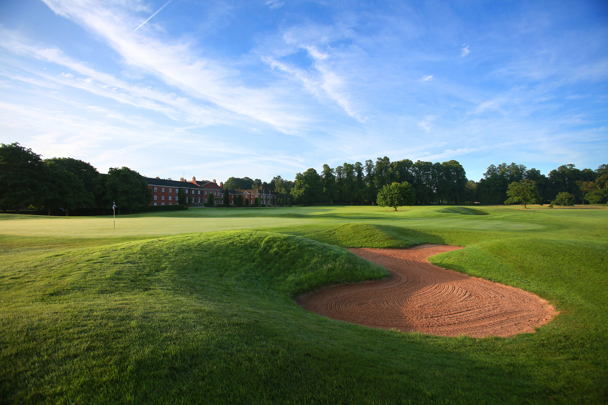 Hole with bunker and building in background at Mottram Hall Golf Course