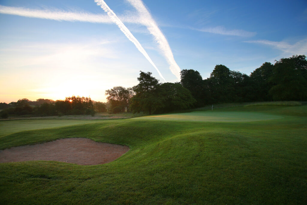 Hole with bunker and trees around at Mottram Hall Golf Course
