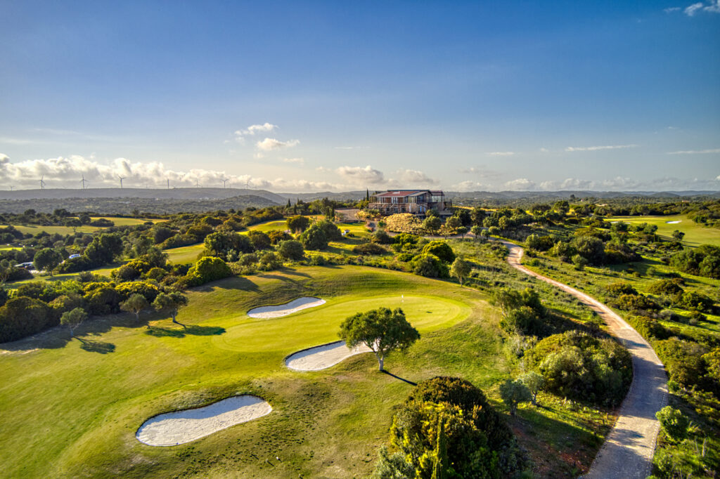Aerial biew of golf course with building in distance at Espiche